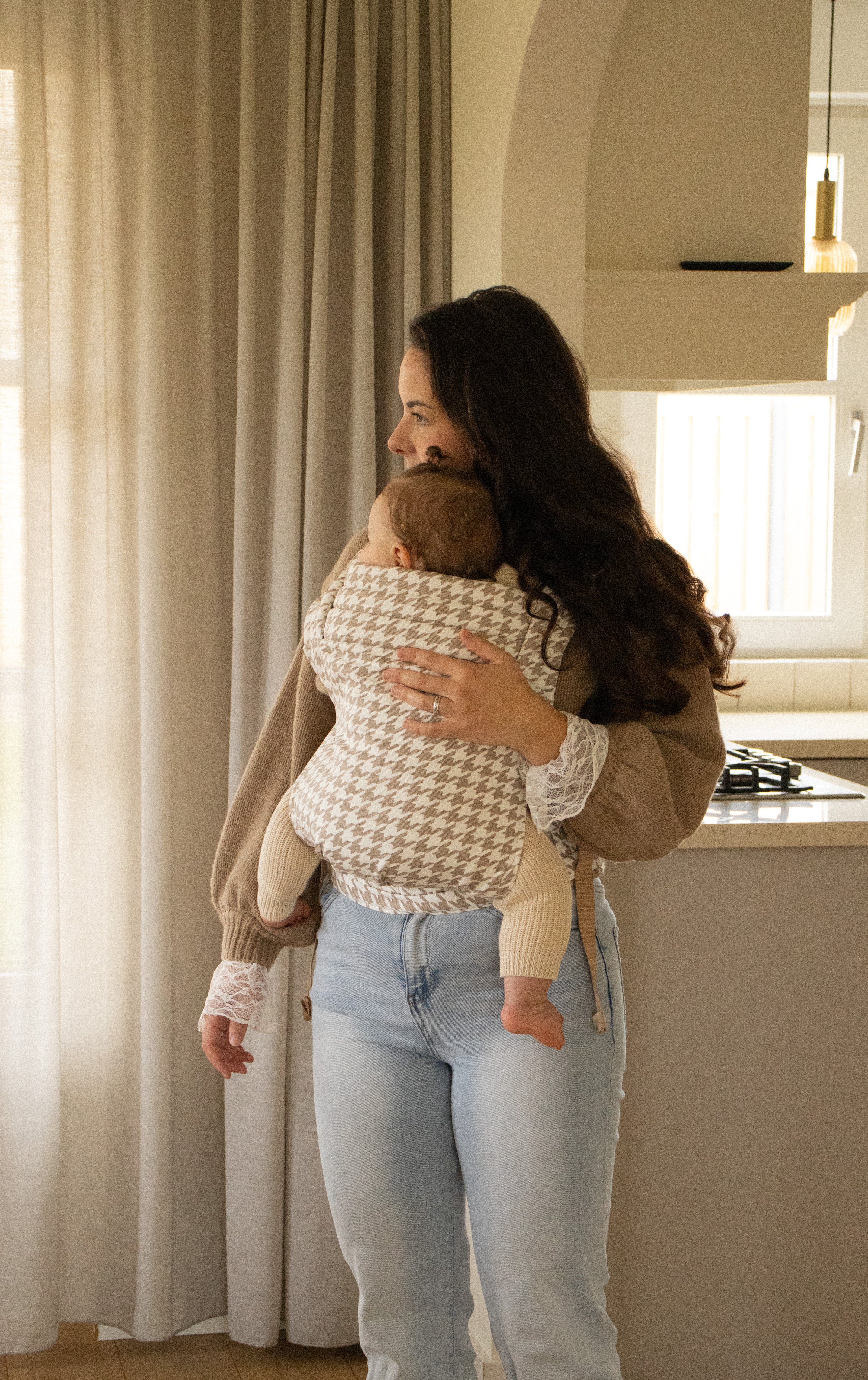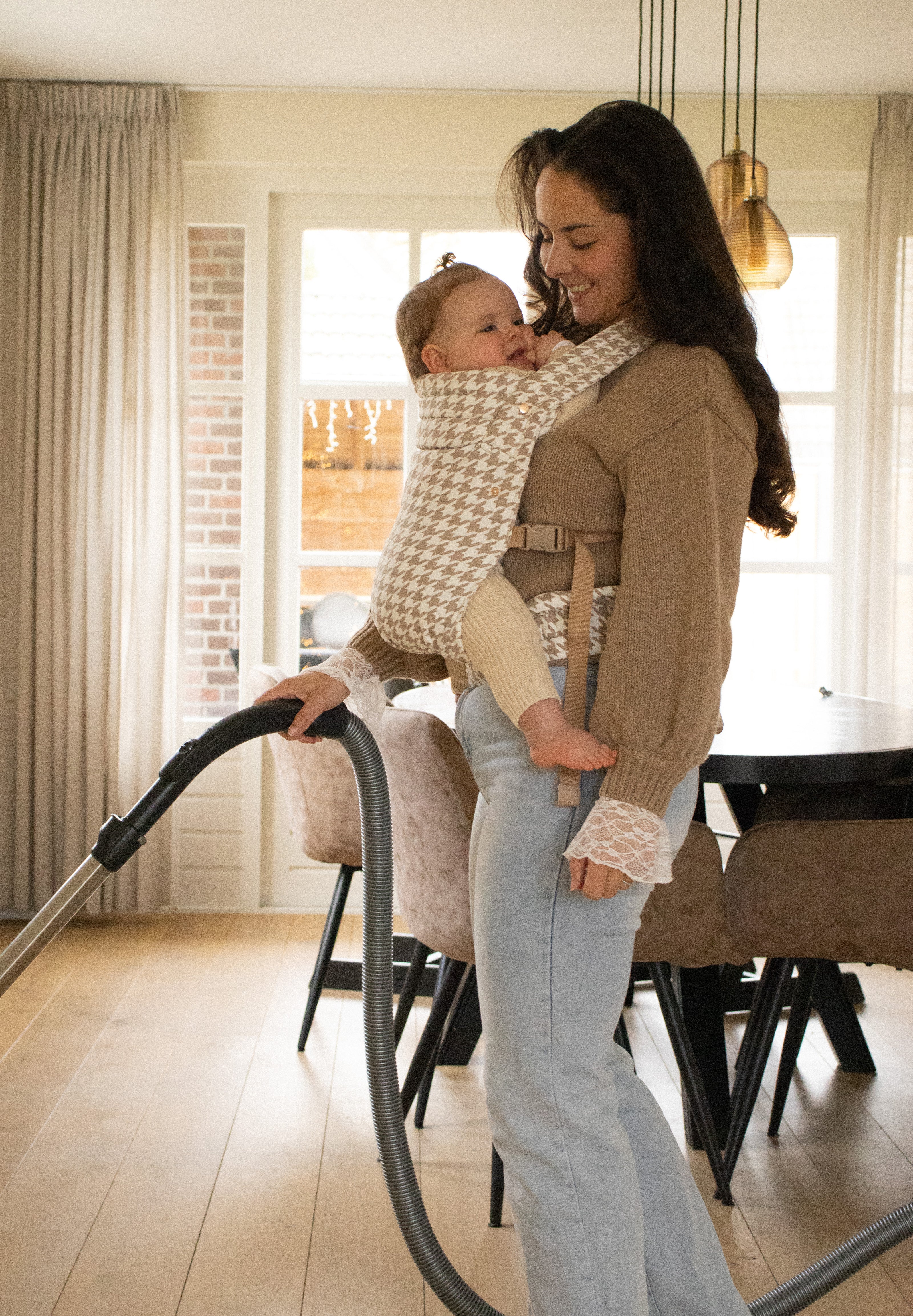 - doe dit gelijktijdig en controleer dat je baby comfortabel zit, niet te strak tegen je aan, en dat het hoofdje vrij kan bewegen.