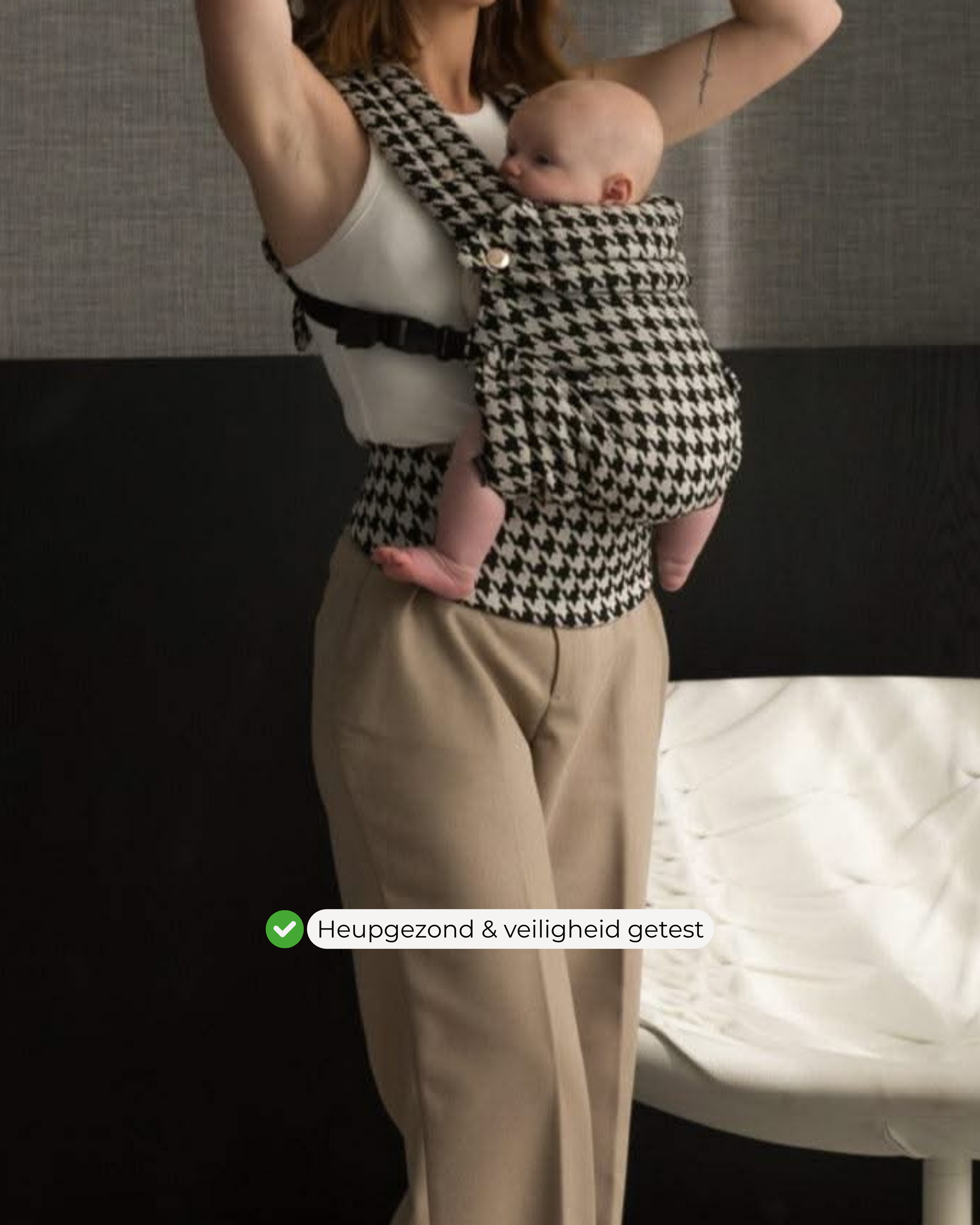 - doe dit gelijktijdig en controleer dat je baby comfortabel zit, niet te strak tegen je aan, en dat het hoofdje vrij kan bewegen.