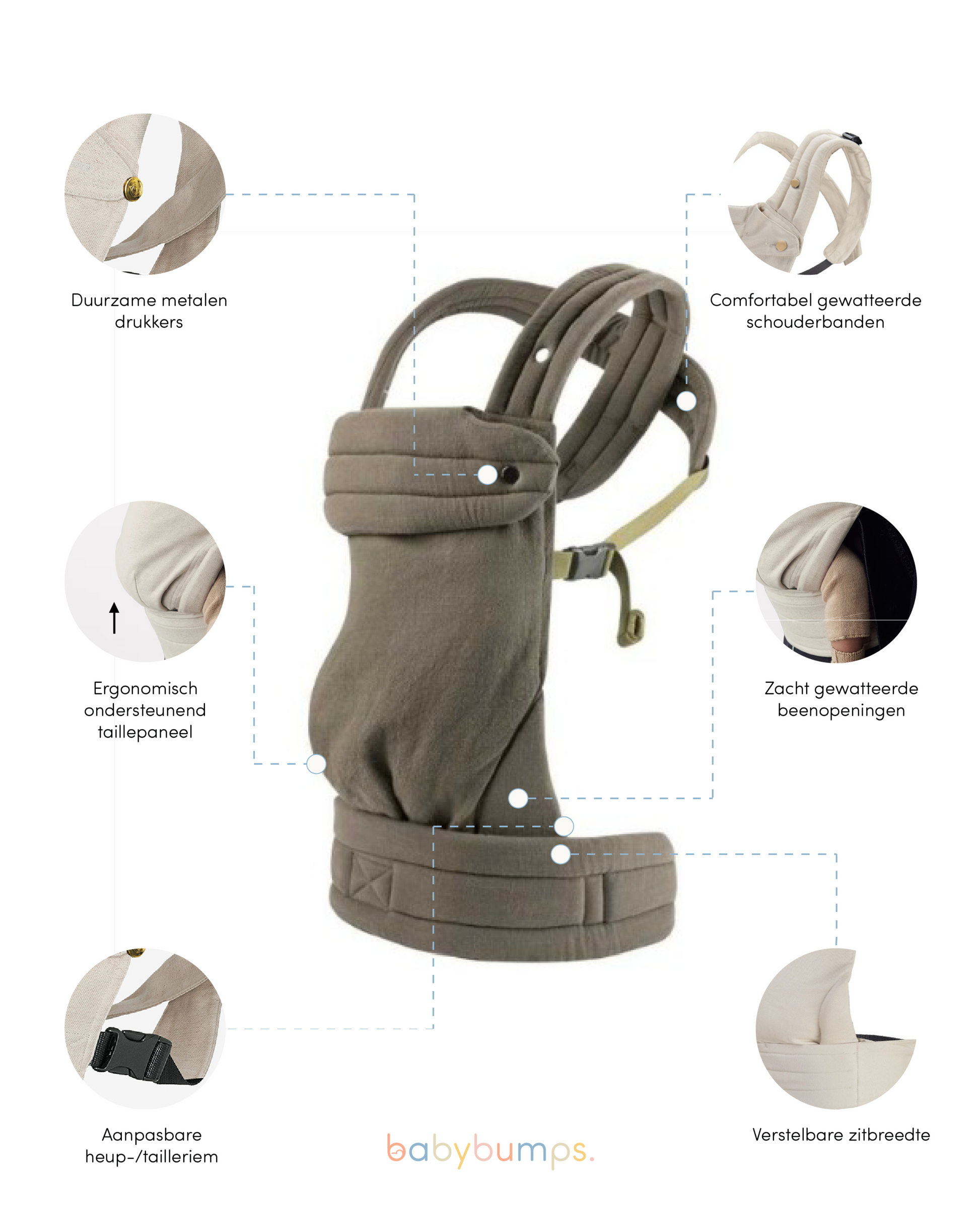 De Babybumps Draagzak combineert stijl, comfort en gebruiksgemak voor zowel ouder als kind.