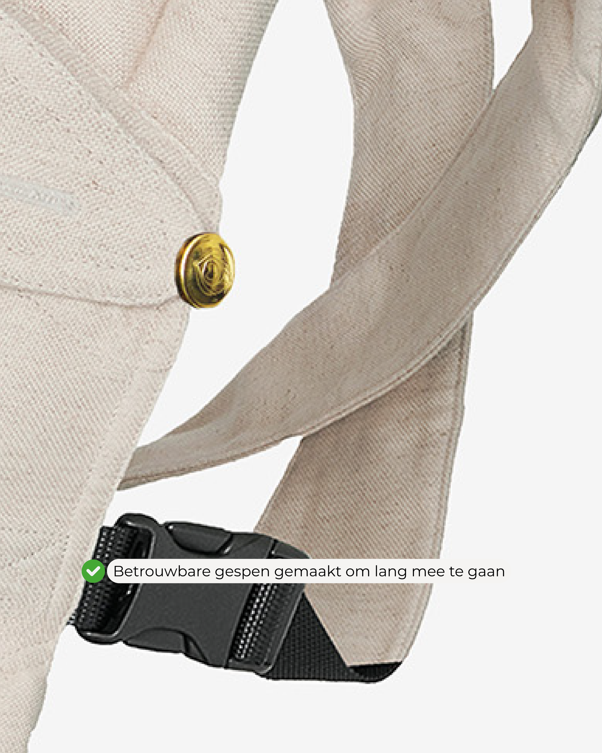Zorg dat de draagzak stevig aansluit en je baby optimaal ondersteunt – niet te los, maar ook niet te strak. Trek de riemen goed aan, zodat je kindje veilig blijft zitten en vrij kan ademen, zonder het risico om weg te zakken.
